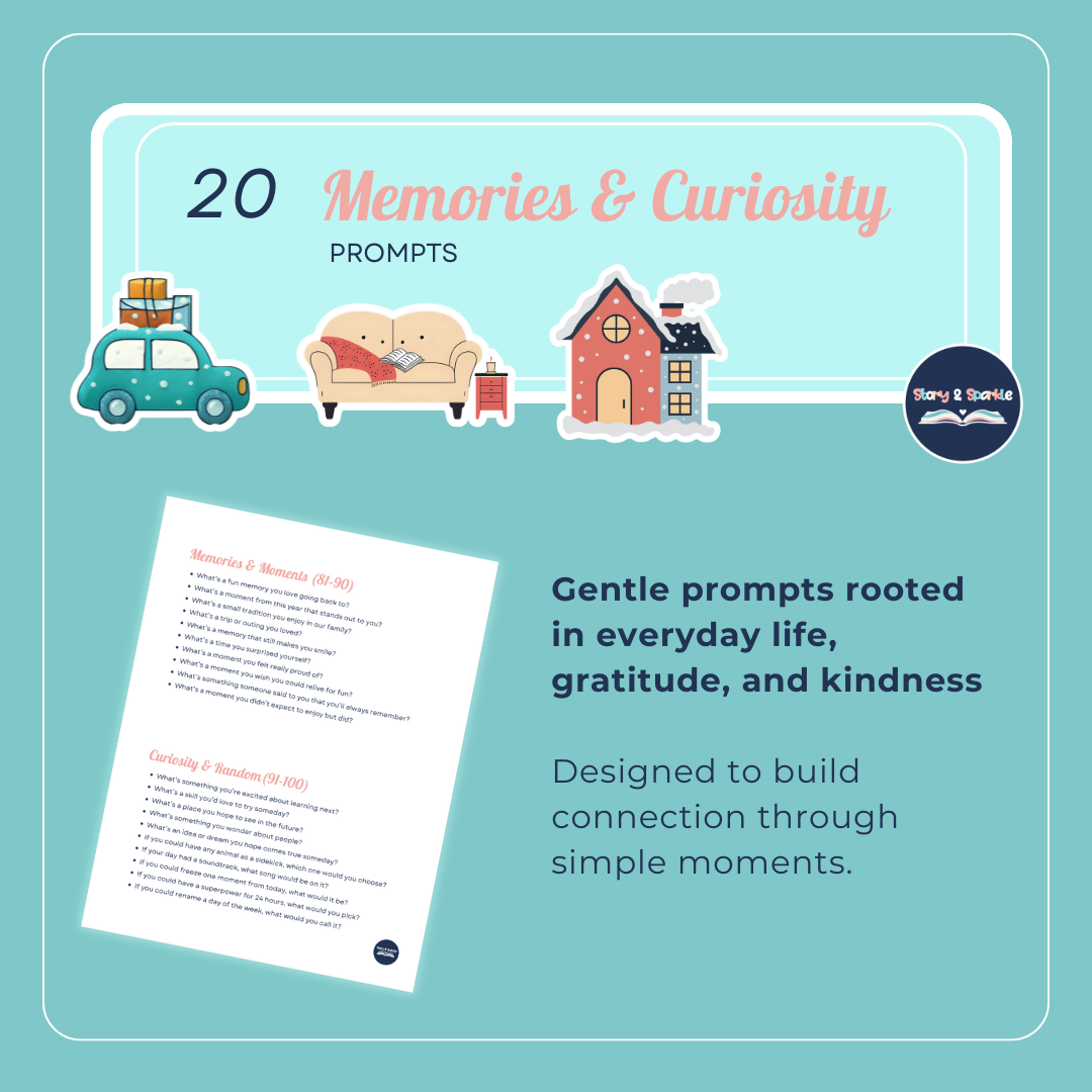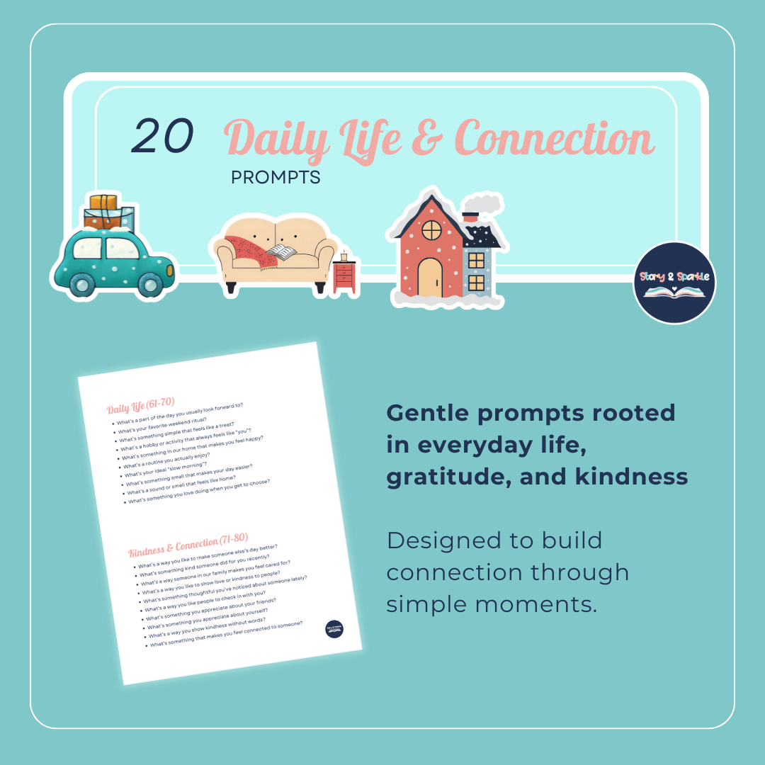 A thoughtfully designed set of printable conversation prompts rooted in everyday life, gratitude, kindness, and play.